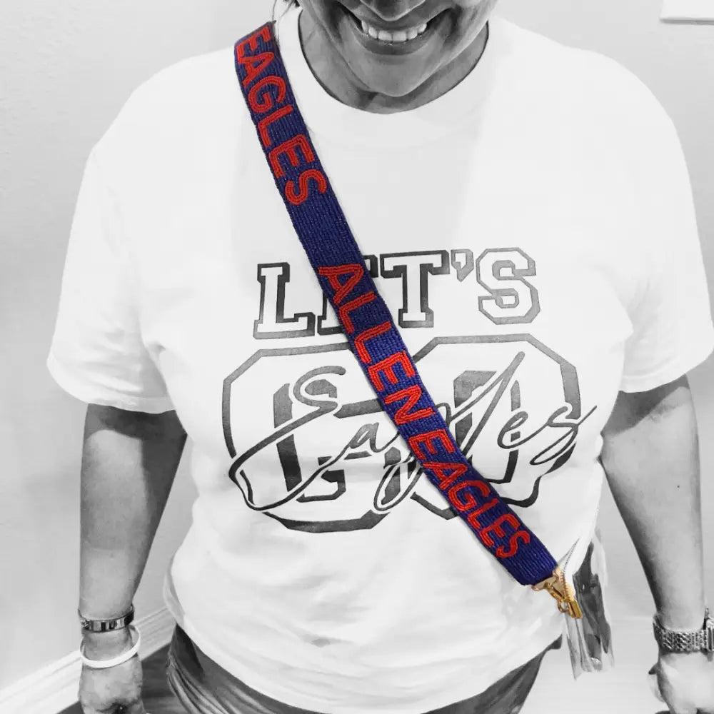 Elevate your game day look with the Allen Eagles Beaded Purse Strap! This eye-catching strap features bold red and blue beading with "Allen Eagles" text, perfect for adding school spirit to any purse or bag. Show off your pride in style with this must-have accessory for Allen Eagles fans!