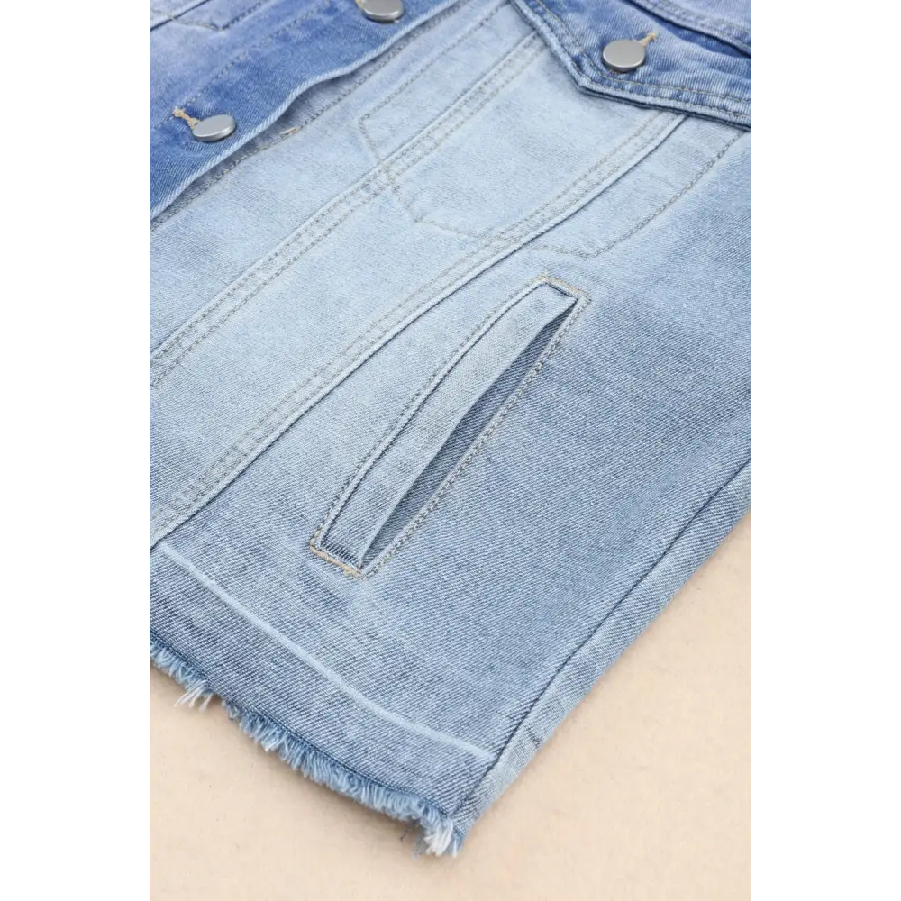 - Features: Buttoned, Pocketed, Raw Hem, Distressed